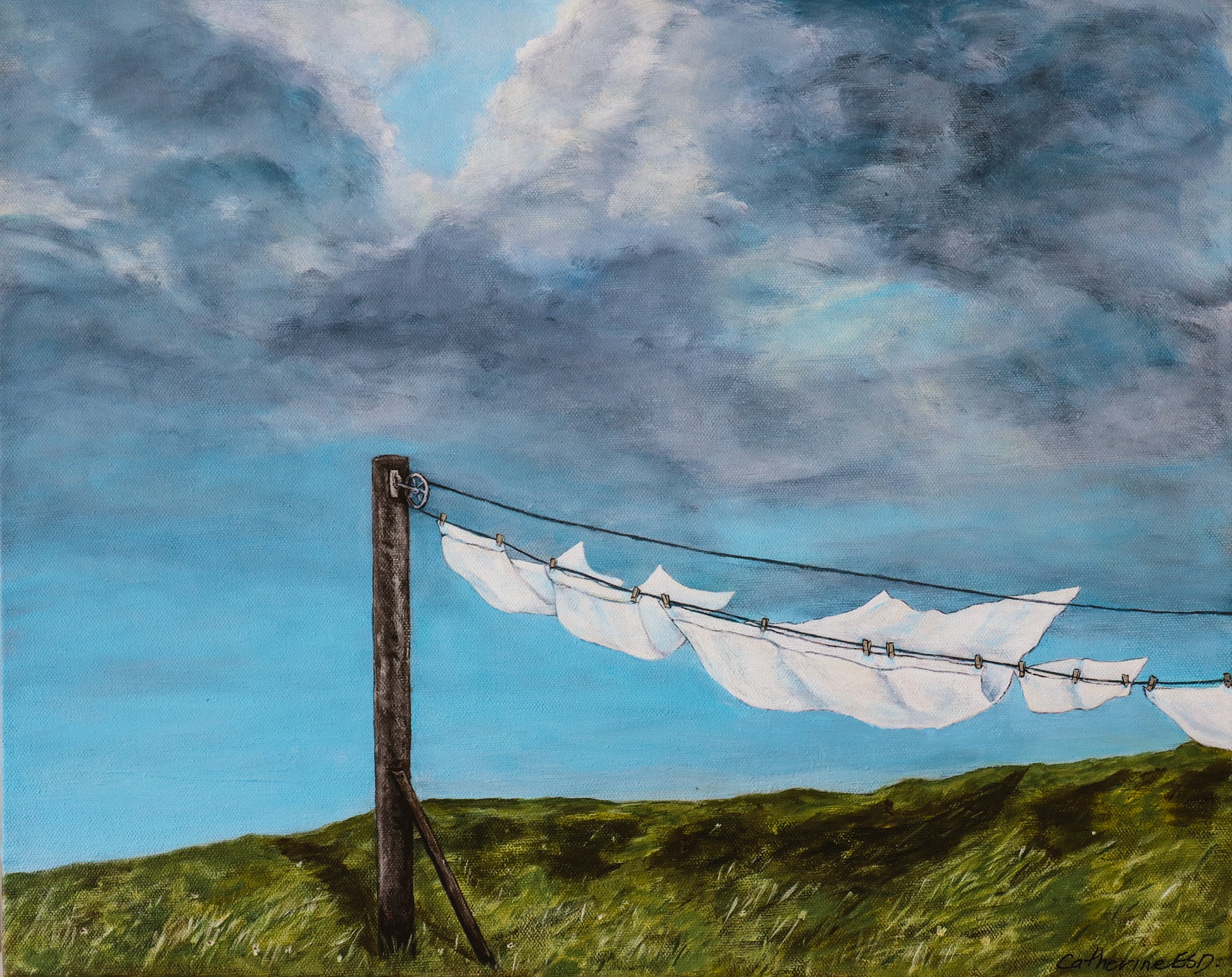 The linens pegged up on a still, sunny day whispering their wishes up to the sky...Oh! Send us some rain to tickle our threads! Oh! Send us wild wind to ride so high! So fun! So free!