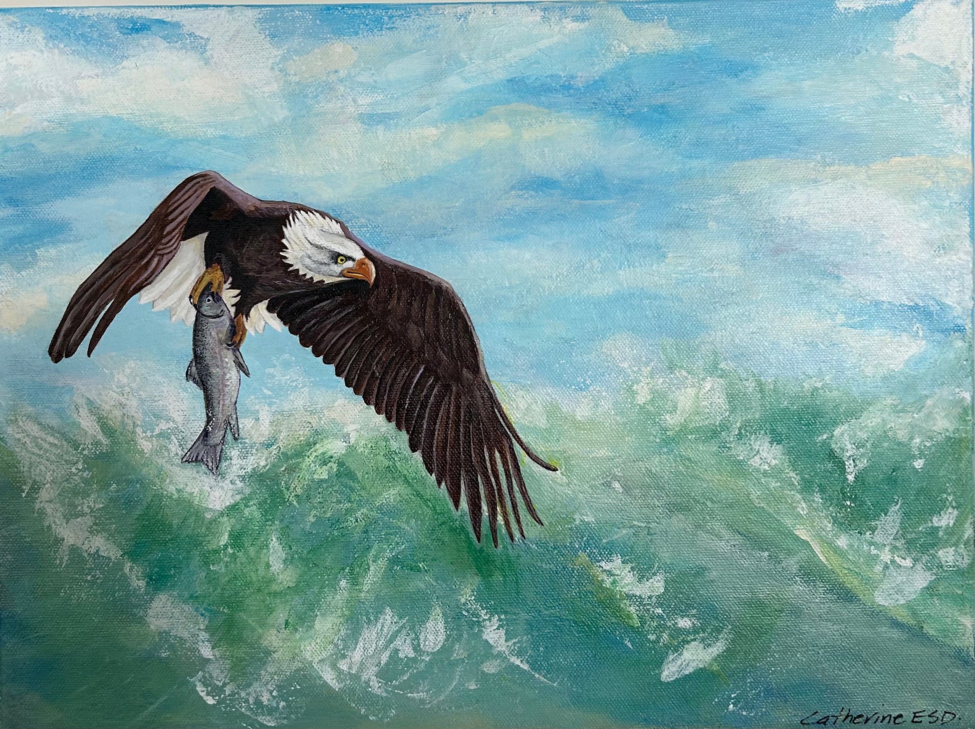 With eyes so keen, I peruse the ocean banquet. With wings so strong, I dive at rocket speed. With talons so sharp, I spear my tasty dinner.
